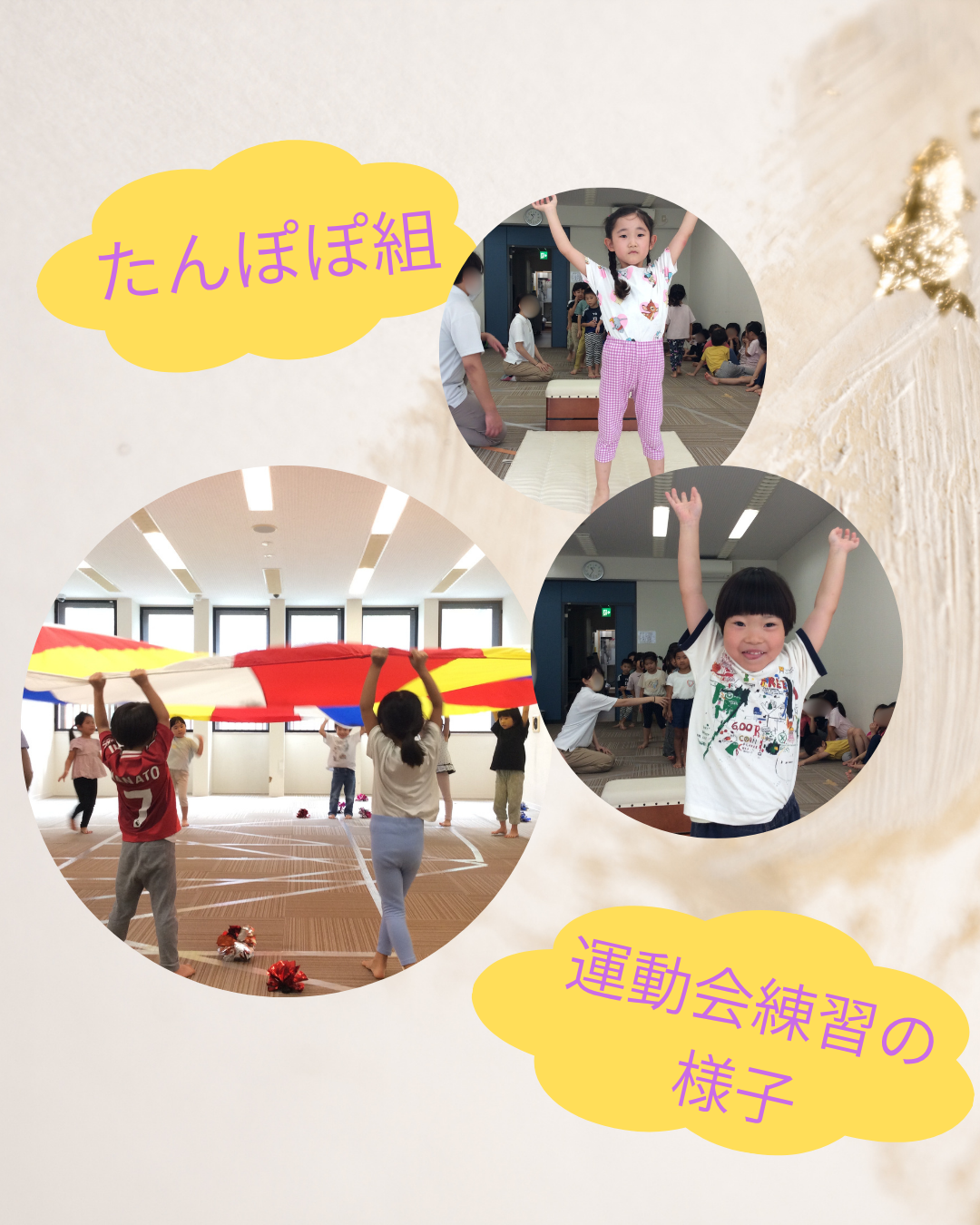 入園式、進級式、クラス懇談会、こどもの日、七夕集会、夏祭り、水遊び、お楽しみ保育、運動会、ハロウィン、親子遠足、勤労感謝の日(地域交流)、クリスマス会、生活発表会、節分集会、ひな祭り、お別れ遠足、卒園式 など