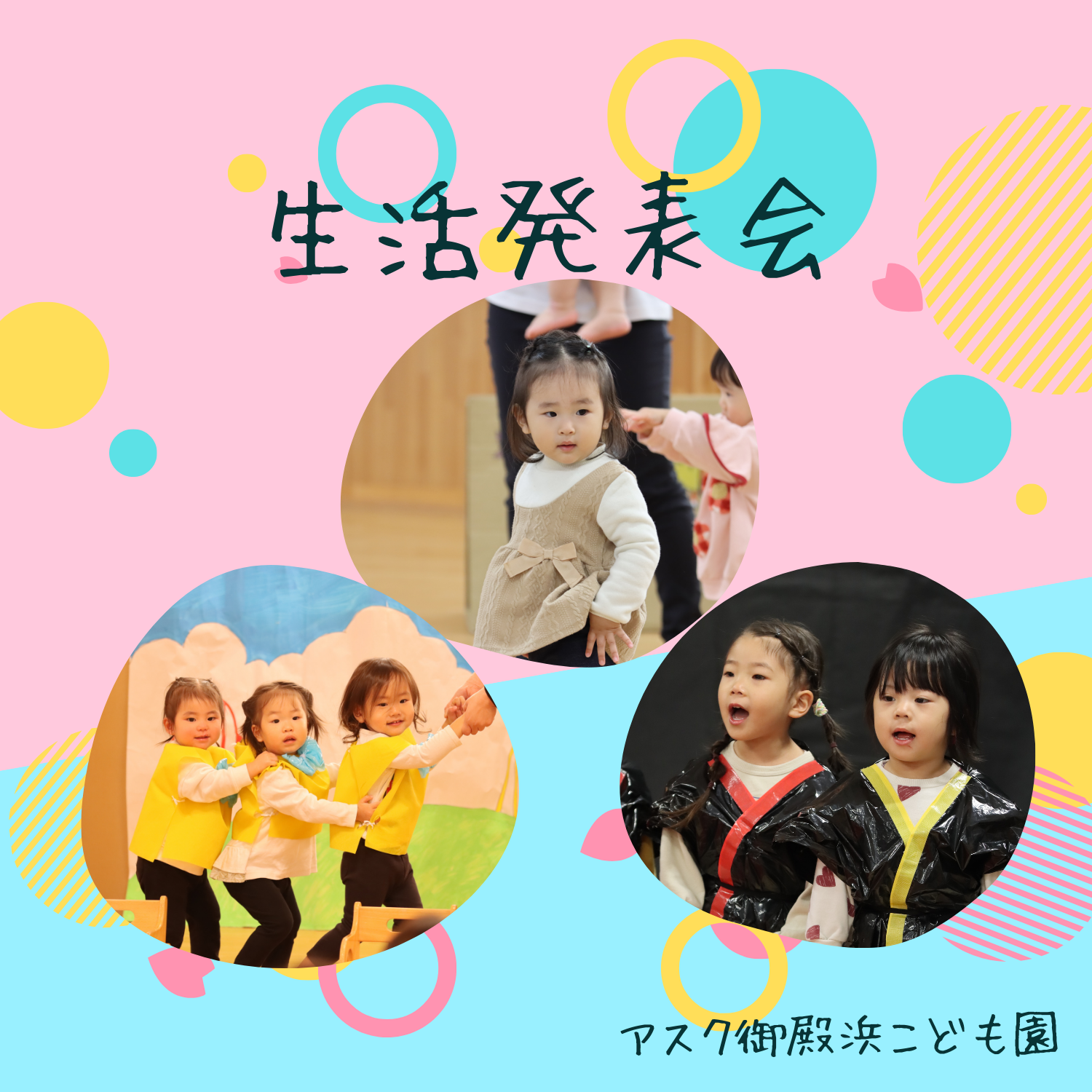 入園式、進級式、クラス懇談会、こどもの日、七夕集会、夏祭り、水遊び、お楽しみ保育、運動会、ハロウィン、親子遠足、勤労感謝の日(地域交流)、クリスマス会、生活発表会、節分集会、ひな祭り、お別れ遠足、卒園式 など