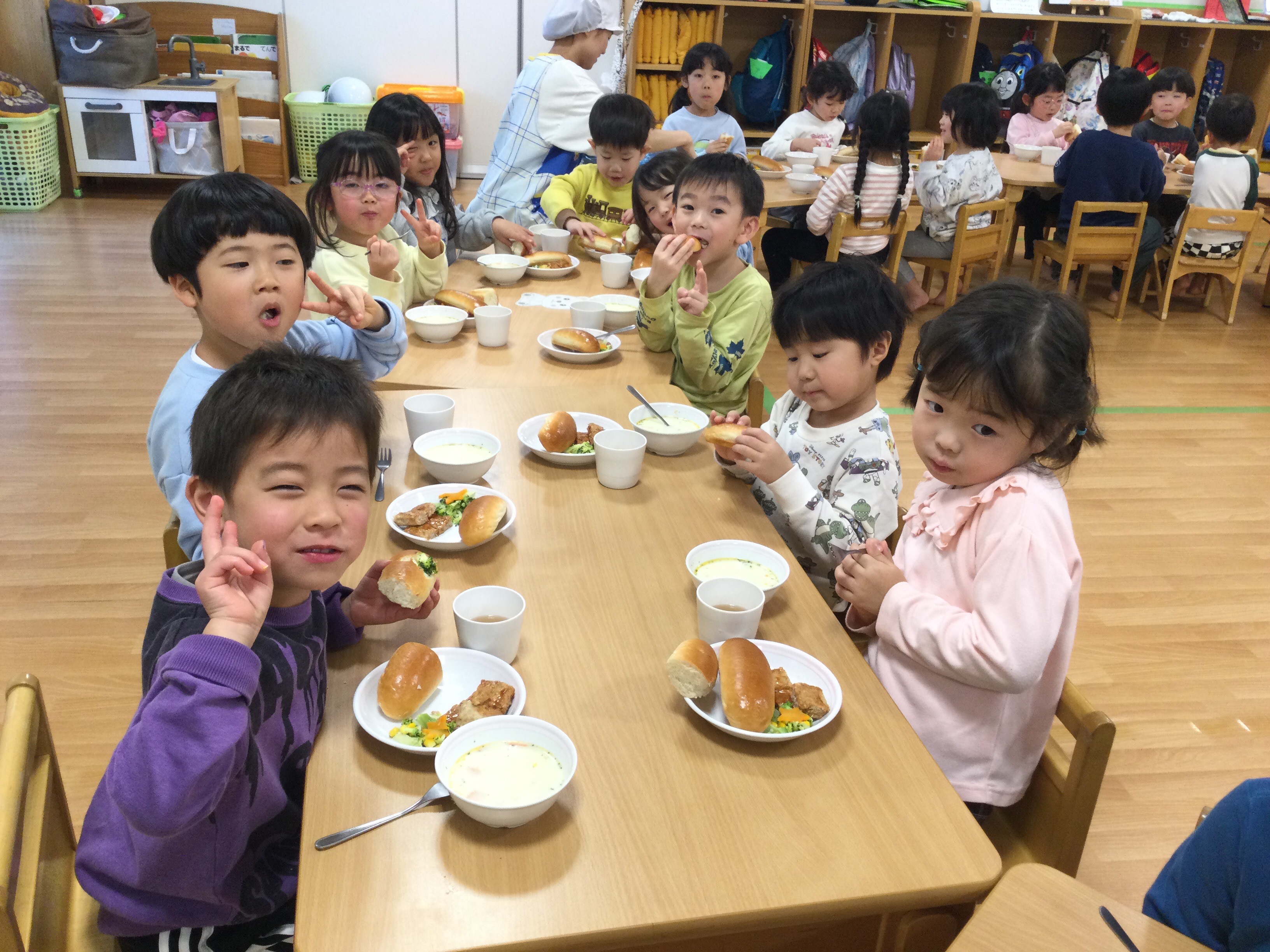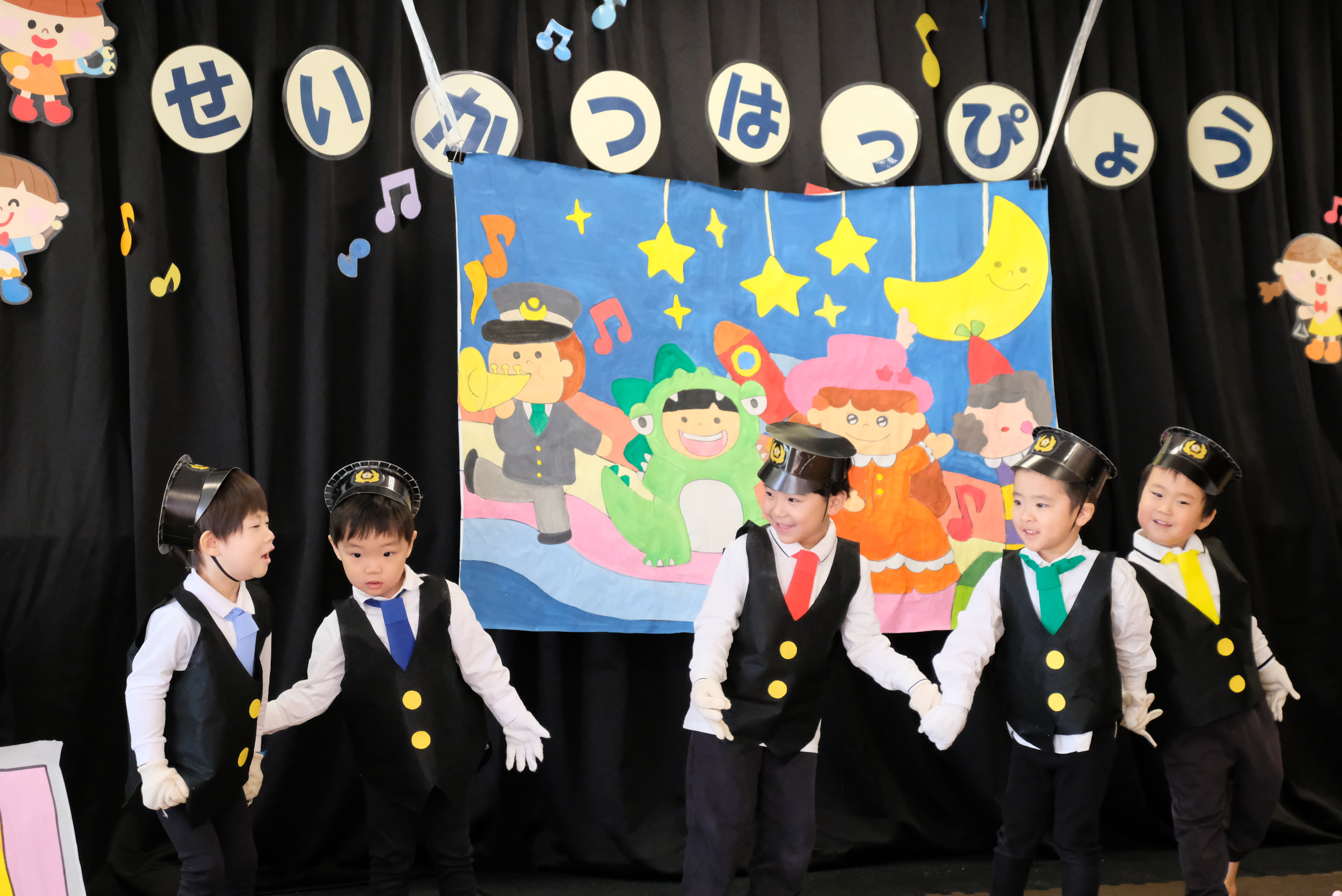 入園式、進級式、クラス懇談会、こどもの日、七夕集会、夏祭り、水遊び、お楽しみ保育、運動会、ハロウィン、親子遠足、勤労感謝の日(地域交流)、クリスマス会、生活発表会、節分集会、ひな祭り、お別れ遠足、卒園式 など