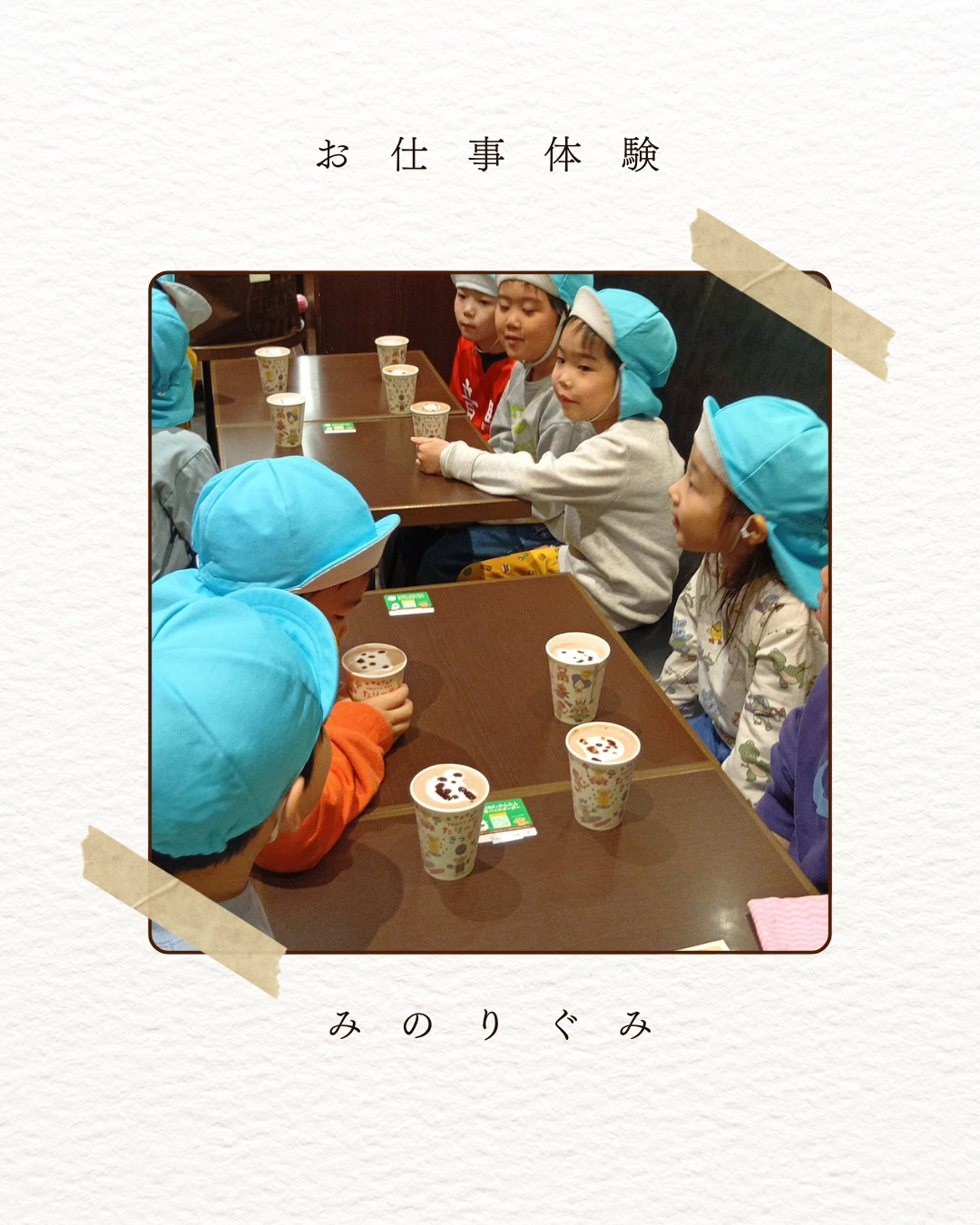 5歳児クラスが職場体験に行ってきました!お掃除や、「いらっしゃいませ」と元気にお客さんに挨拶をしてきました♪ラテアートにも挑戦させてもらいましたよ!