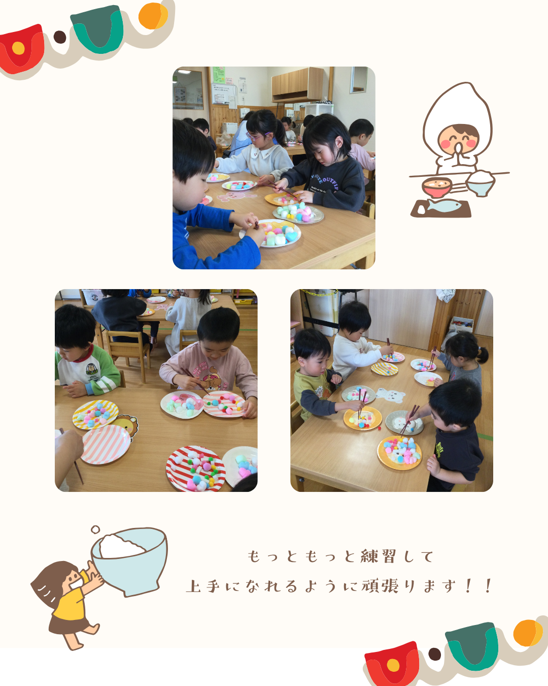3歳児クラスで、進級に向けて箸の練習をしました♪ 難しいと言いながらも一生懸命練習する子どもたちでした。