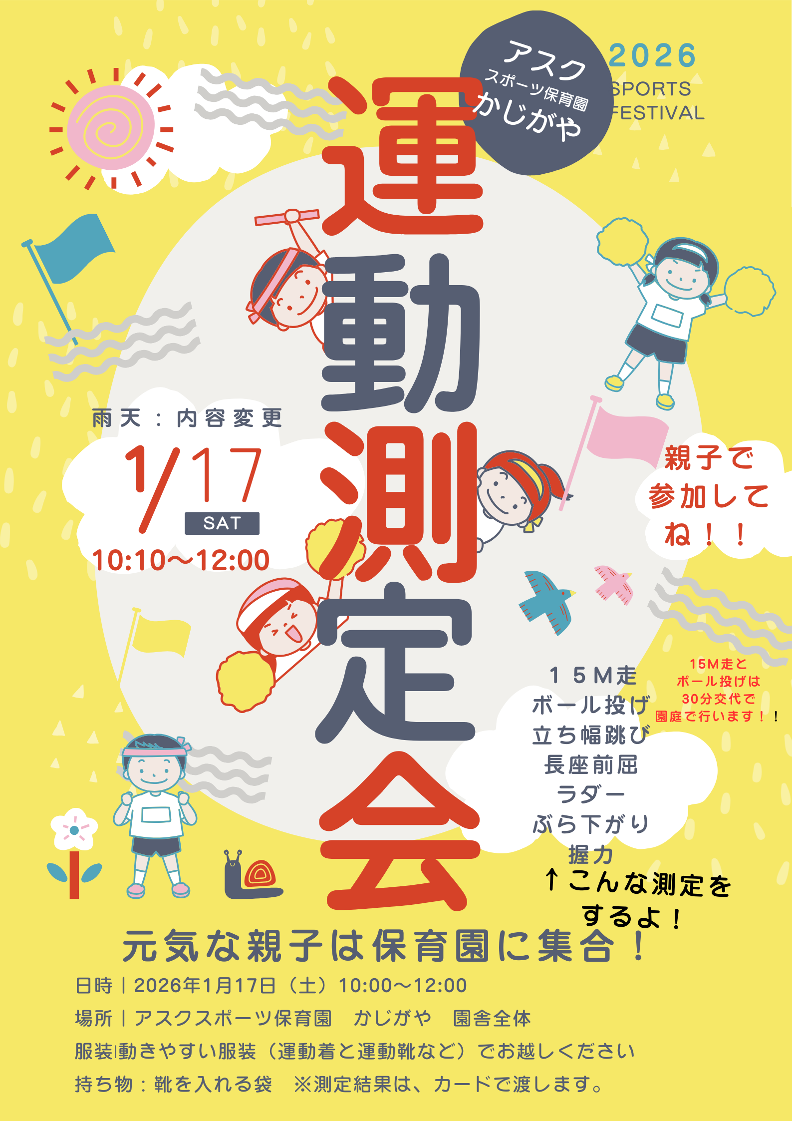 入園式、進級式、クラス懇談会、こどもの日、七夕集会、夏祭り、水遊び、お楽しみ保育、運動会、ハロウィン、親子遠足、勤労感謝の日(地域交流)、クリスマス会、生活発表会、節分集会、ひな祭り、お別れ遠足、卒園式 など