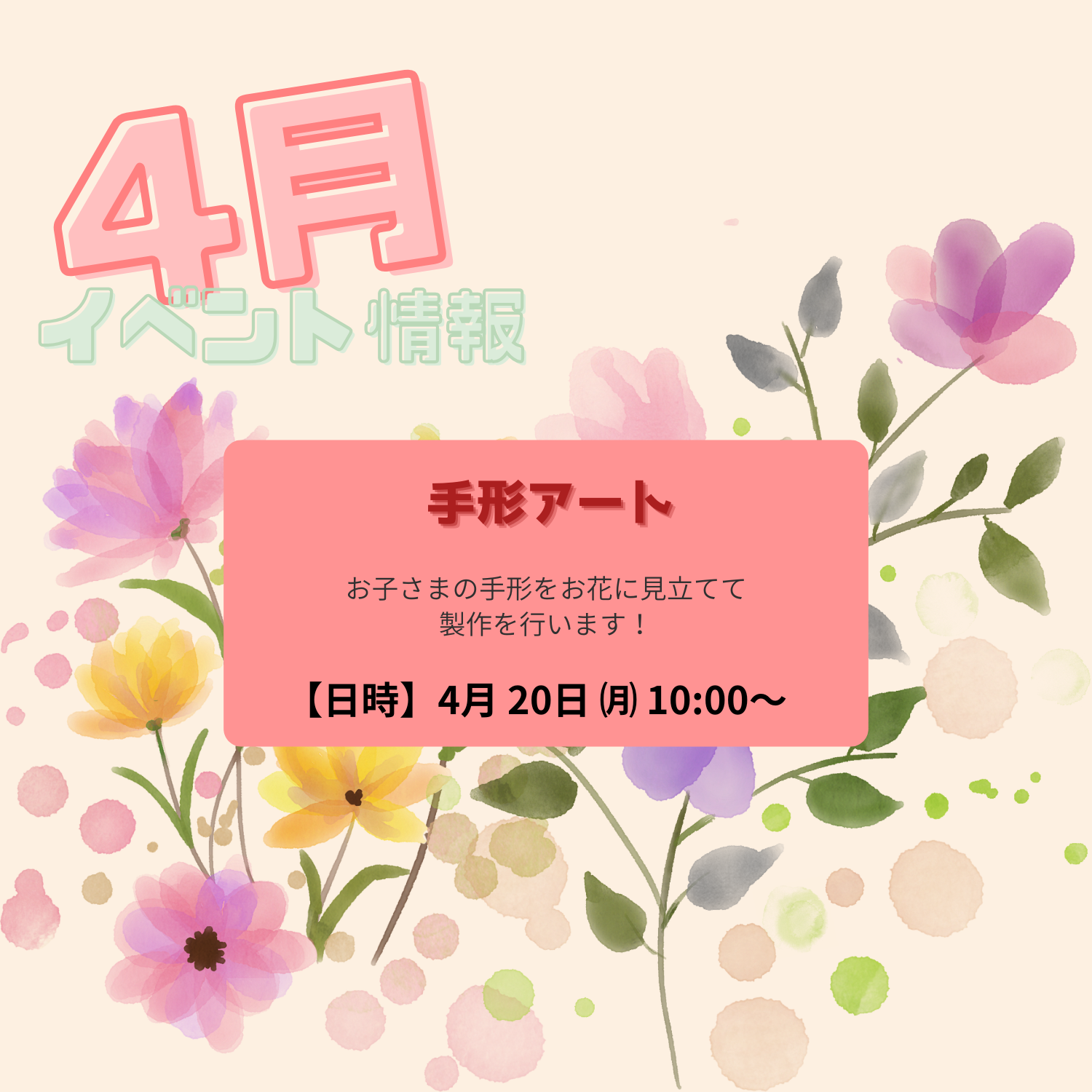 入園式、進級式、クラス懇談会、こどもの日、七夕集会、夏祭り、水遊び、お楽しみ保育、運動会、ハロウィン、親子遠足、勤労感謝の日(地域交流)、クリスマス会、生活発表会、節分集会、ひな祭り、お別れ遠足、卒園式 など