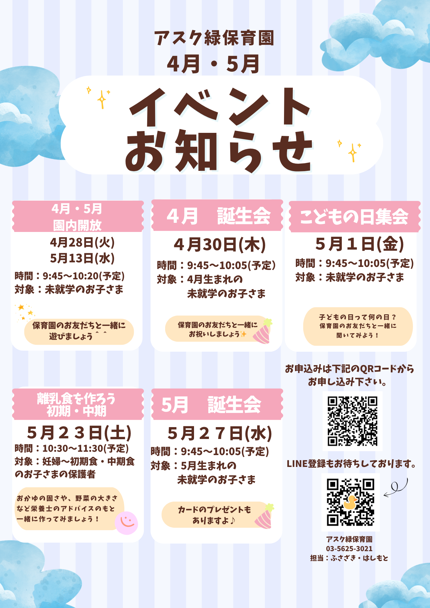 入園式、進級式、クラス懇談会、こどもの日、七夕集会、夏祭り、水遊び、お楽しみ保育、運動会、ハロウィン、親子遠足、勤労感謝の日(地域交流)、クリスマス会、生活発表会、節分集会、ひな祭り、お別れ遠足、卒園式 など
