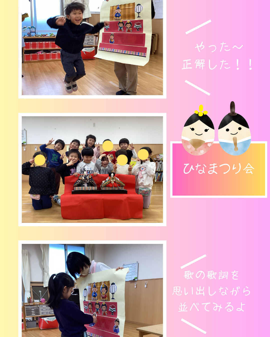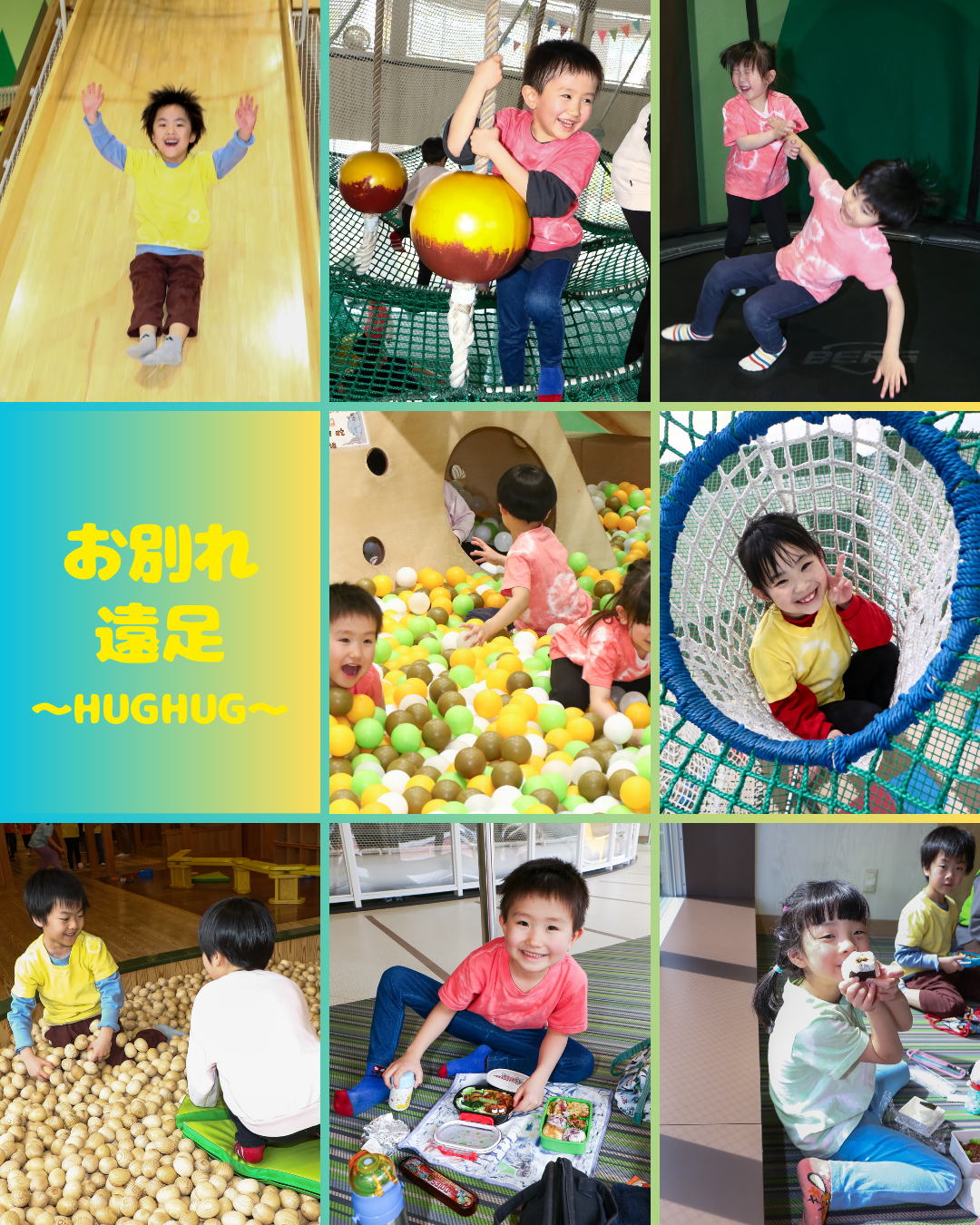 入園式、進級式、クラス懇談会、こどもの日、七夕集会、夏祭り、水遊び、お楽しみ保育、運動会、ハロウィン、親子遠足、勤労感謝の日(地域交流)、クリスマス会、生活発表会、節分集会、ひな祭り、お別れ遠足、卒園式 など