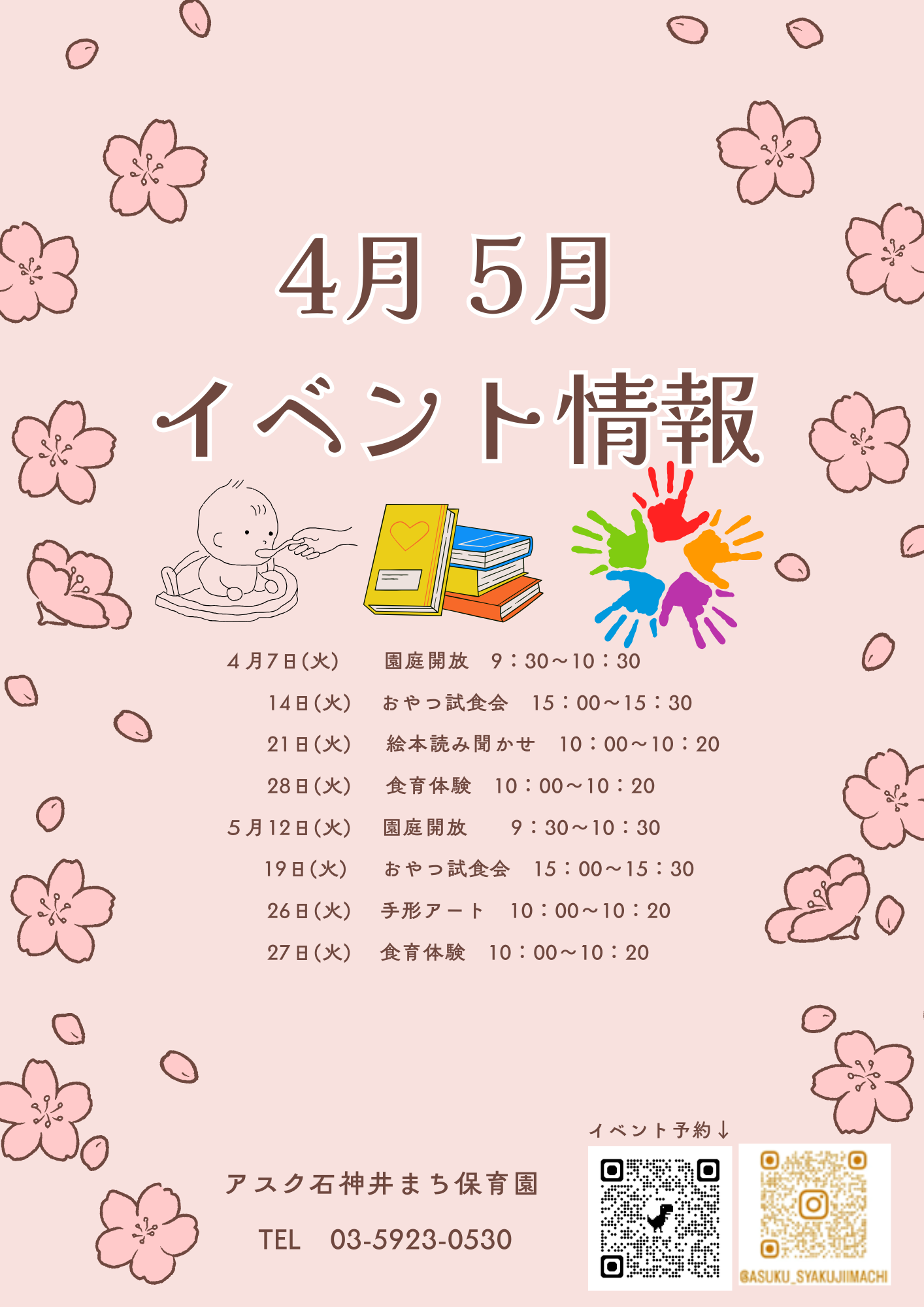 入園式、進級式、クラス懇談会、こどもの日、七夕集会、夏祭り、水遊び、お楽しみ保育、運動会、ハロウィン、親子遠足、勤労感謝の日(地域交流)、クリスマス会、生活発表会、節分集会、ひな祭り、お別れ遠足、卒園式 など