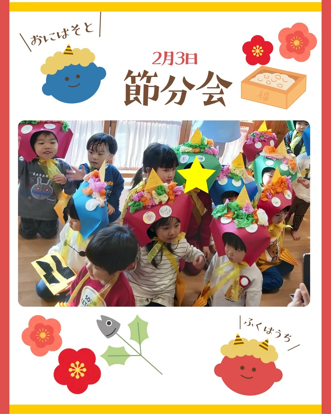 入園式、進級式、クラス懇談会、こどもの日、七夕集会、夏祭り、水遊び、お楽しみ保育、運動会、ハロウィン、親子遠足、勤労感謝の日(地域交流)、クリスマス会、生活発表会、節分集会、ひな祭り、お別れ遠足、卒園式 など